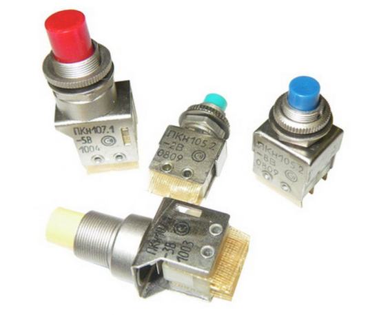 ПКН107М-6 переключатель кнопочный с цветной кнопкой, без подсветки, с фиксацией, с одной или двумя группами переключателей предназначены для работы в электрических цепях постоянного и переменного тока в РЭА.