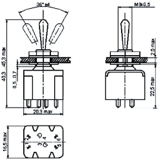 ПТ6-12В переключатель тумблерный, применяется для коммутации цепи сигнализации, питания и управления с напряжением 1х10-4В - 250В, силой тока 1х10-6А - 16А и коммутируемой мощностью до 1900Вт. Тумблеры выполняются с рычажным приводом, позволяющим укреплять резиновый защитный протектор и так и без него. В зависимости от фиксации рычага тумблеры выпускаются с фиксацией в трех положениях, в одном крайнем и среднем положениях и только в среднем положении. Монтаж проводов проводится пайкой.